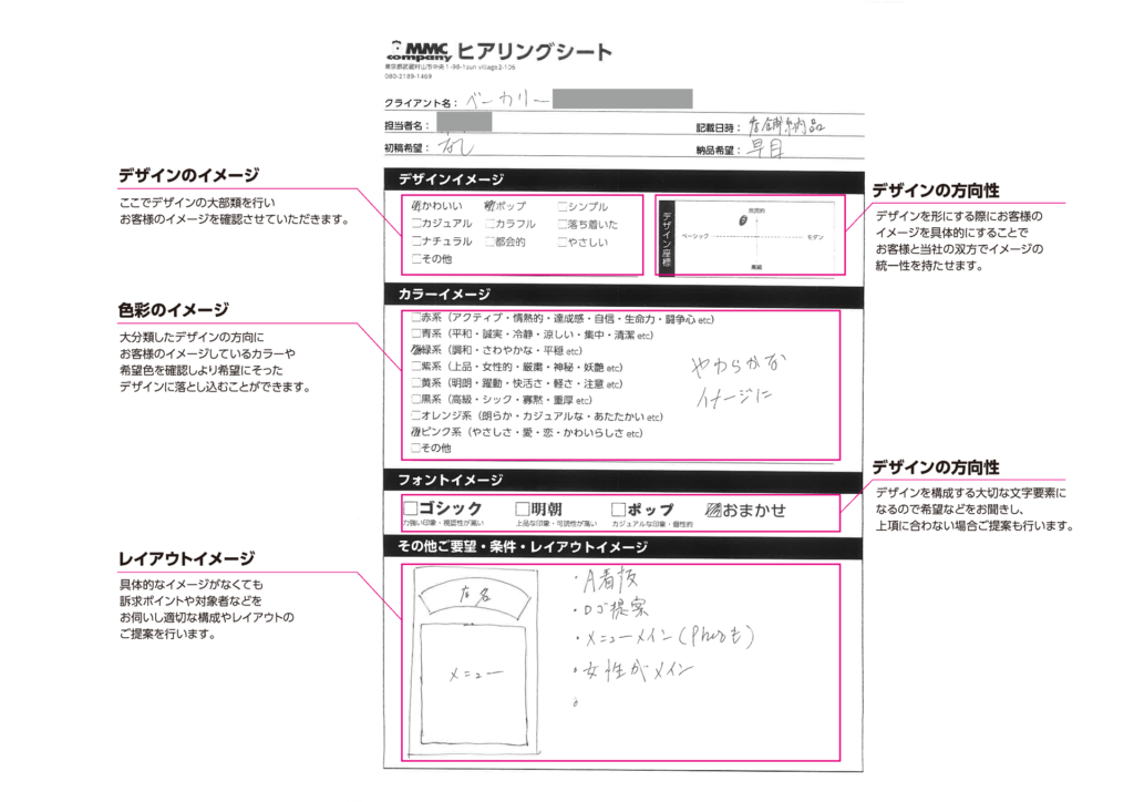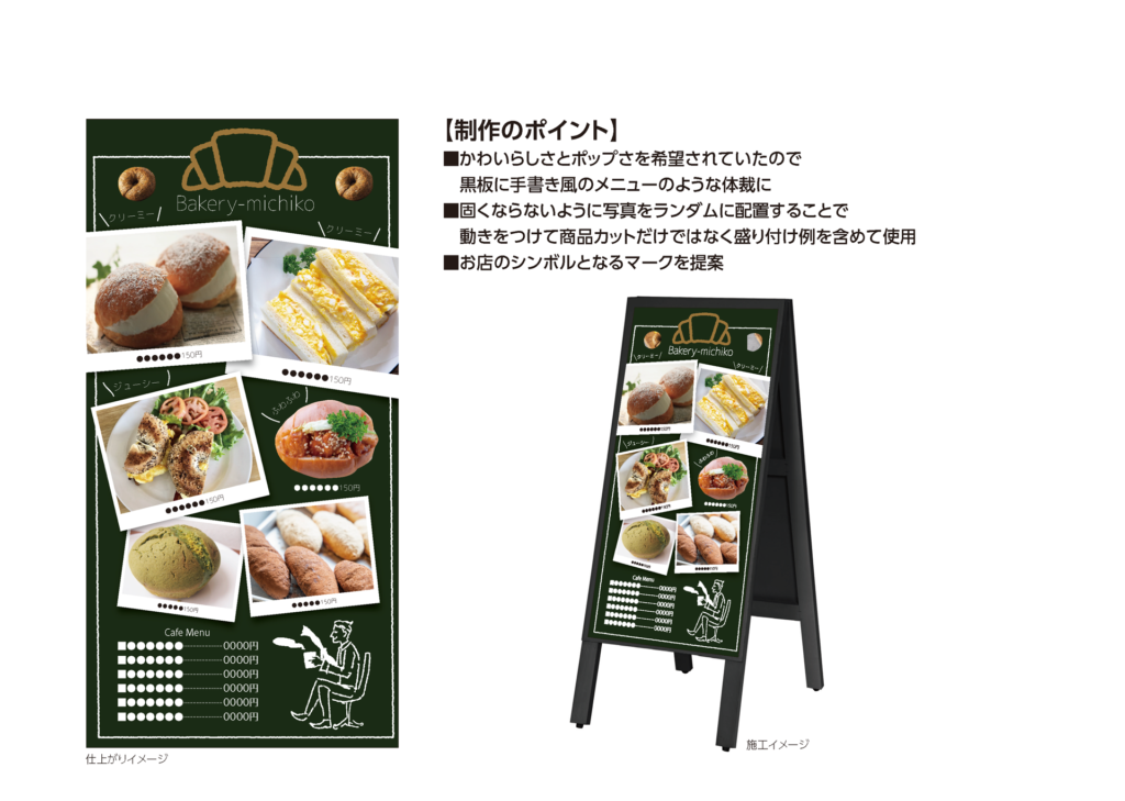 | 制作のポイント | ■かわいらしさとポップさを希望されていたので黒板に手書き風のメニューのような体裁に ■固くならないように写真をランダムに配置することで動きをつけて商品カットだけではなく盛り付け例を含めて使用 ■お店のシンボルとなるマークを提案 |